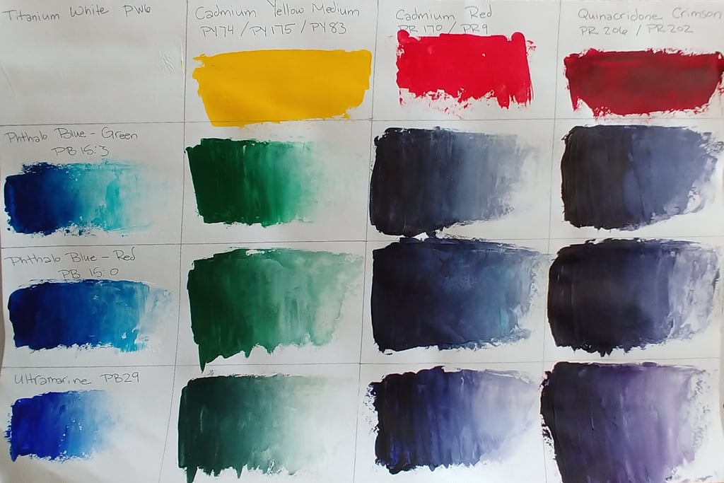 Speaking of not playing nicely with others, in researching Phthalo pigments, I read multiple times that they are much stronger than other blue pigments, and hoo boy did I find that to be true. A little Phthalo goes a long way, for both the Red and Green shades. Since all three blues that I tested were Golden brand, this wasn't an issue of one brand being more generous with their percentage of pigment than another. The Phthalo pigments were just more powerful than the Ultramarine, which made them more difficult to mix well, including being less responsive to being mixed with the Titanium White.