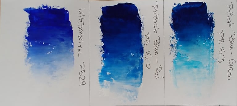 One thing that I do like about Phthalo Blue Red Shade is that by itself, it is a nicer warm blue than Ultramarine. When mixed with the Titanium White, Ultramarine Blue looked muted and almost gray, whereas Phthalo Blue Red Shade provided vibrant hues. So by itself, Phthalo Blue Red Shade has a leg up on Ultramarine. It just doesn't play nicely with others.